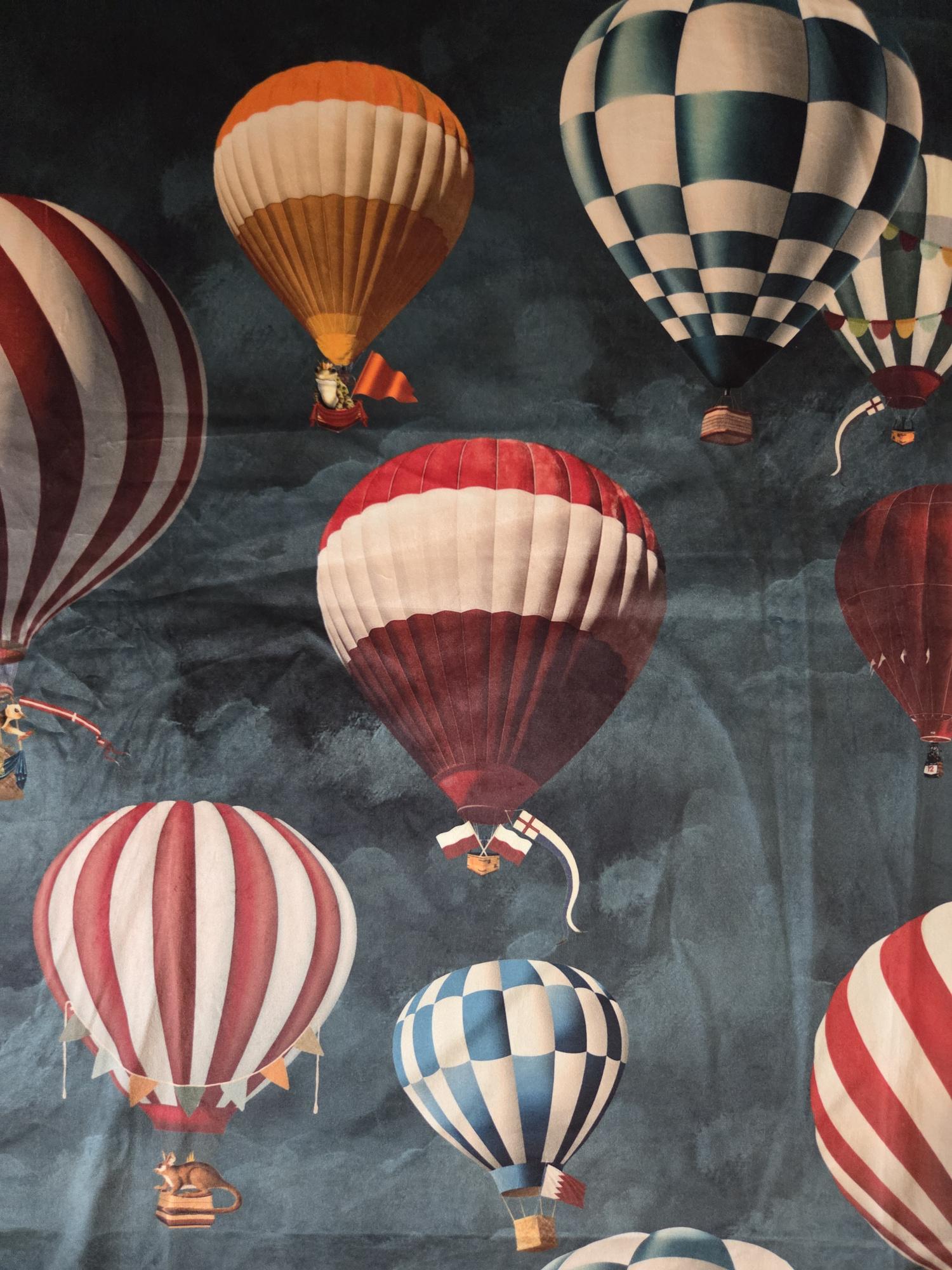 Ein kuschliger Velour mit großen Heißluftballons. Der Stoff eigent sich für Vorhänge, Kissen, Raffrollo.