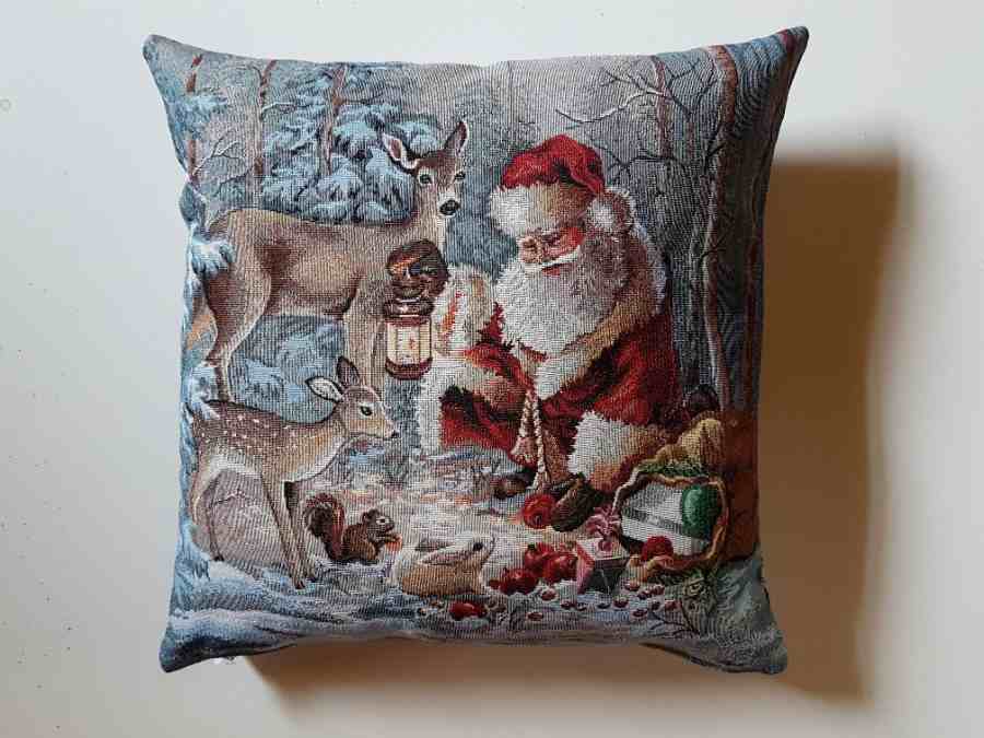 Entzückendes Weihnachtskissen aus Gobelinstoff. Das Muster ist auf Vor- und Rückseite. Das Kissen ist 45 x 45 cm groß mit Reißverschluss.