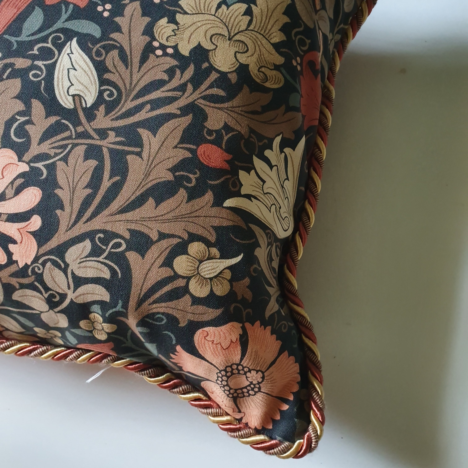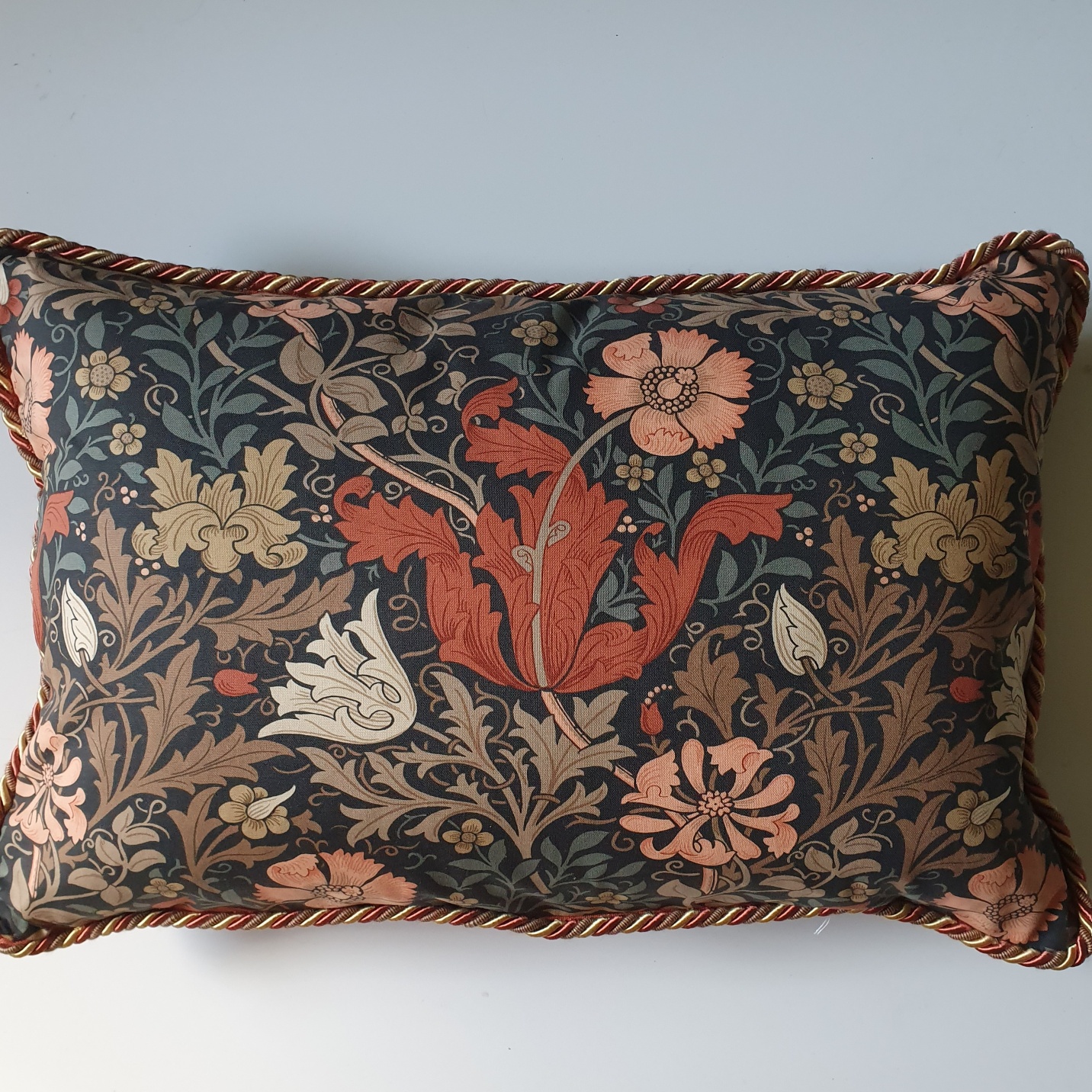 Ein Großes Kissen 40x60cm groß, gefertigt in unserem Nähstelier. Vorne original William Morris Stoff, Rückseite uni Velour/bordaux. Mit Liebe zum Detail ist das Kissen mit einer hochwertigen Kordel eingefasst.