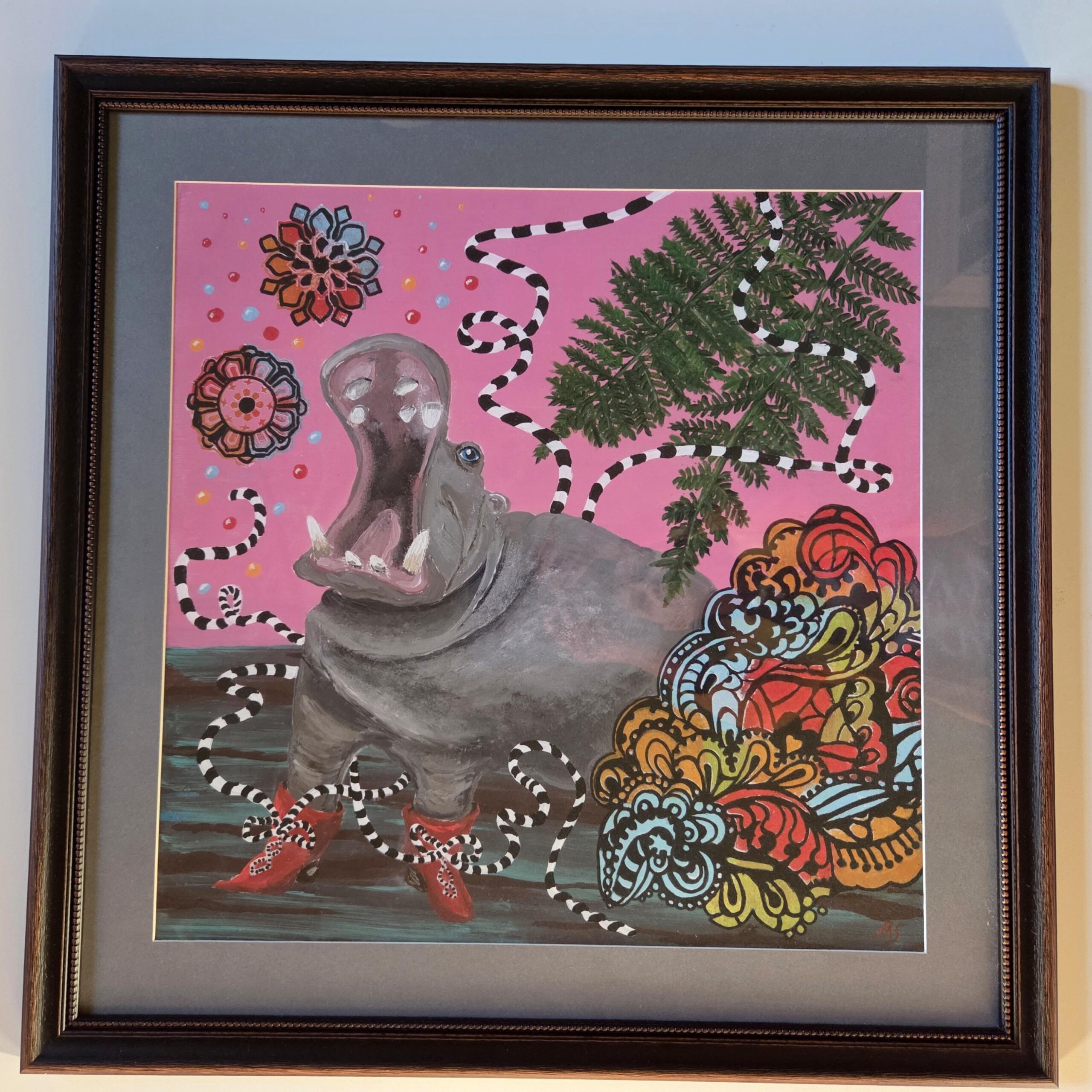 Das Nilpferd  Bild „Who is the boss“ mit Rahmen 60×60 cm groß in einem hochwertigen Hahnemühle Papier. 308g Baumwolle in Museumsqualität (Kunstkopie.) Gerahmt ist das Bild in einem  in einem hochwertigen Holzrahmen mit aufwendigem Profil mit Passepartout.