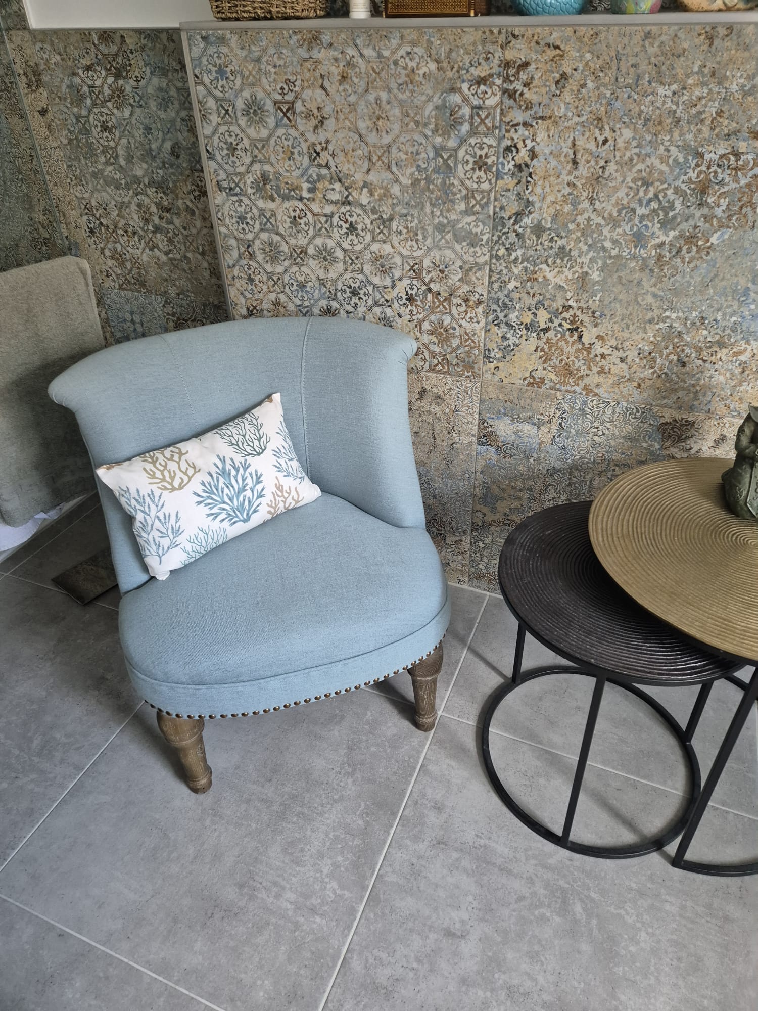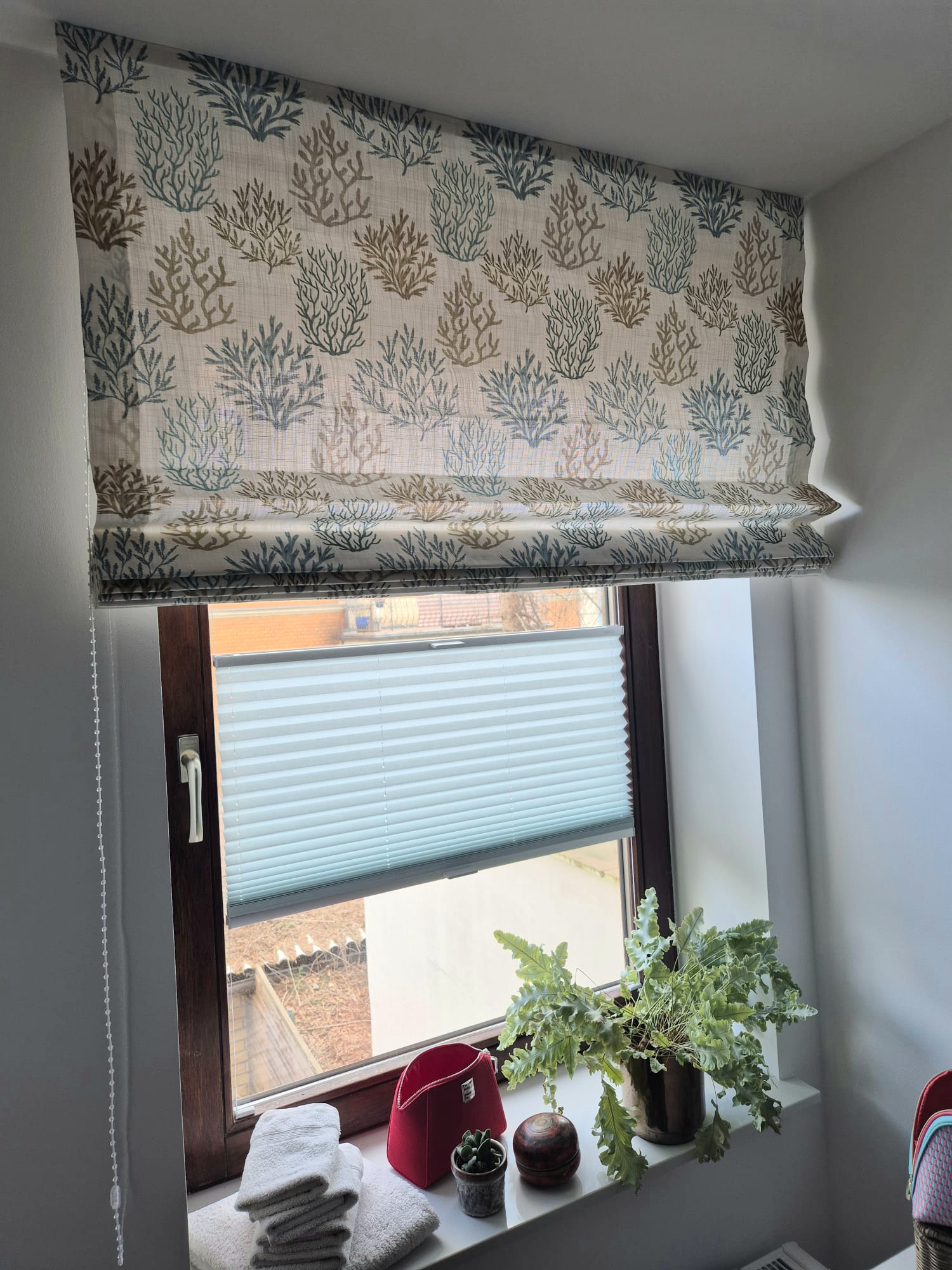 Maritimer Stoff mit Korallendesign. Matte Oberfläche mit Struktur. Eine schöne Farbkomposition in blau und beige Tönen, dadurch wirkt der Stoff warm ohne den maritimen Charakter zu verlieren. Die einzelnen Korallen sind ca 14cm groß.